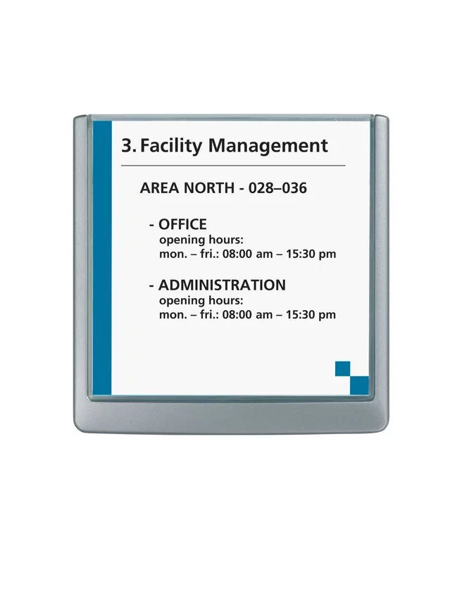 Nowoczesna tabliczka informacyjna Click Sign to praktyczne i estetyczne rozwiązanie do oznaczania pomieszczeń w biurach, hotelach, szkołach czy placówkach medycznych. Kompaktowy format 149 x 148,5 mm, matowa osłona zapobiegająca odbiciom światła oraz grafitowa ramka nadają jej profesjonalny wygląd. Łatwy montaż za pomocą śrub lub taśmy samoprzylepnej (w zestawie) umożliwia szybkie i trwałe mocowanie.