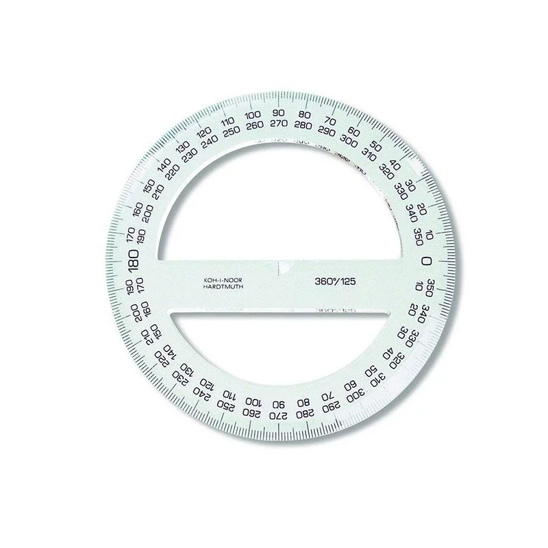 Kątomierz kołowy wykonany z transparentnego tworzywa sztucznego.