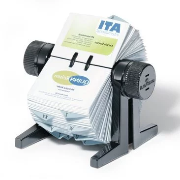 • Kartoteka obrotowa z tworzywa sztucznego, wyposażona w 150 obustronnych wkładów na wizytówki