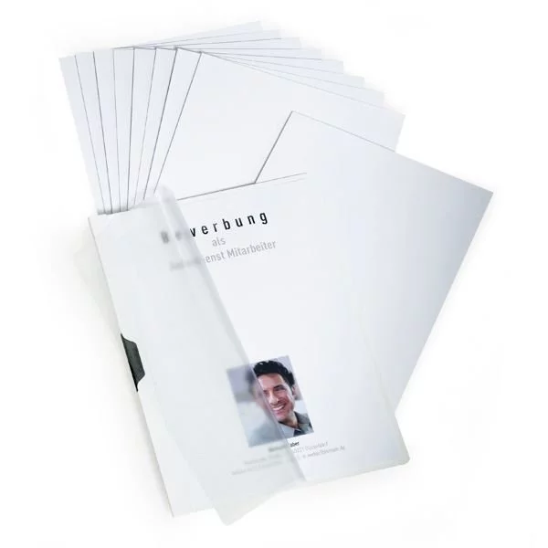 Zestaw Bewerbung składający się z 3 skoroszytów DURACLIP ® (Art.-Nr.: 2200) z wytrzymałym zaciskiem, 9 arkuszy wysokiej jakości, okładki, 4 etykiet adresowych oraz 12-stronicowej książeczki ułatwiającej pisanie aplikacji.