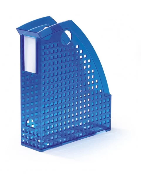 Pojemnik na katalogi Trend w kolorze niebieskim przezroczystym to doskonałe rozwiązanie do przechowywania dokumentów i broszur formatu A4. Posiada otwory do łatwego przenoszenia, a także zabezpieczenie przed przypadkowym spadnięciem podczas wysuwania, co zapewnia większą wygodę i bezpieczeństwo użytkowania. Dodatkowo, wyposażony jest w okienko umożliwiające umieszczenie opisu, co ułatwia organizację i szybki dostęp do przechowywanych materiałów.