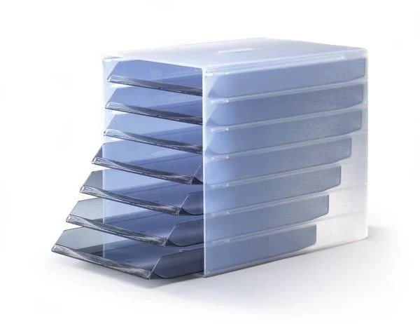 Pojemnik IdealBox z 7 praktycznymi szufladami to funkcjonalne narzędzie do przechowywania dokumentów w formacie C4. Wykonany z trwałego, szarego przezroczystego tworzywa, zapewnia wygodny wgląd w zawartość każdej szuflady bez potrzeby jej otwierania. Pojemnik świetnie sprawdza się jako organizer na biurku, a jego konstrukcja umożliwia także montaż pod blatem lub na ścianie, co czyni go wszechstronnym rozwiązaniem dla każdego biura czy pracowni.