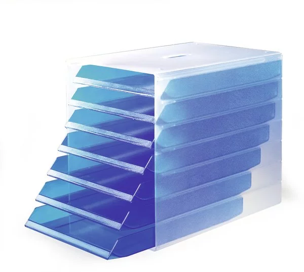 Pojemnik IdealBox z 7 funkcjonalnymi, wysuwalnymi szufladami to praktyczne i estetyczne rozwiązanie do organizacji dokumentów w formacie C4. Wykonany z trwałego, niebieskiego przezroczystego tworzywa, pozwala szybko zlokalizować potrzebne materiały bez konieczności otwierania szuflad. Dzięki kompaktowym wymiarom idealnie sprawdza się na biurku, a możliwość montażu pod blatem lub na ścianie pozwala maksymalnie wykorzystać dostępną przestrzeń. To niezastąpiony element wyposażenia nowoczesnego biura i domowego gabinetu.