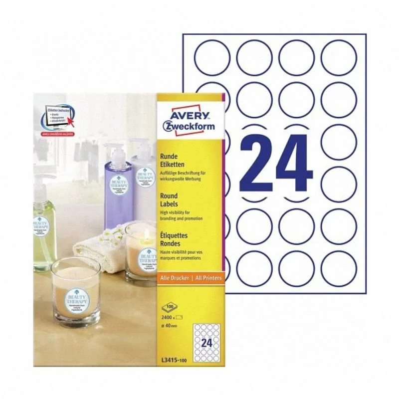 Etykiety Samop. Avery Okrągłe śr. 40mm 24/A4 A'100 Białe No.L3415-100