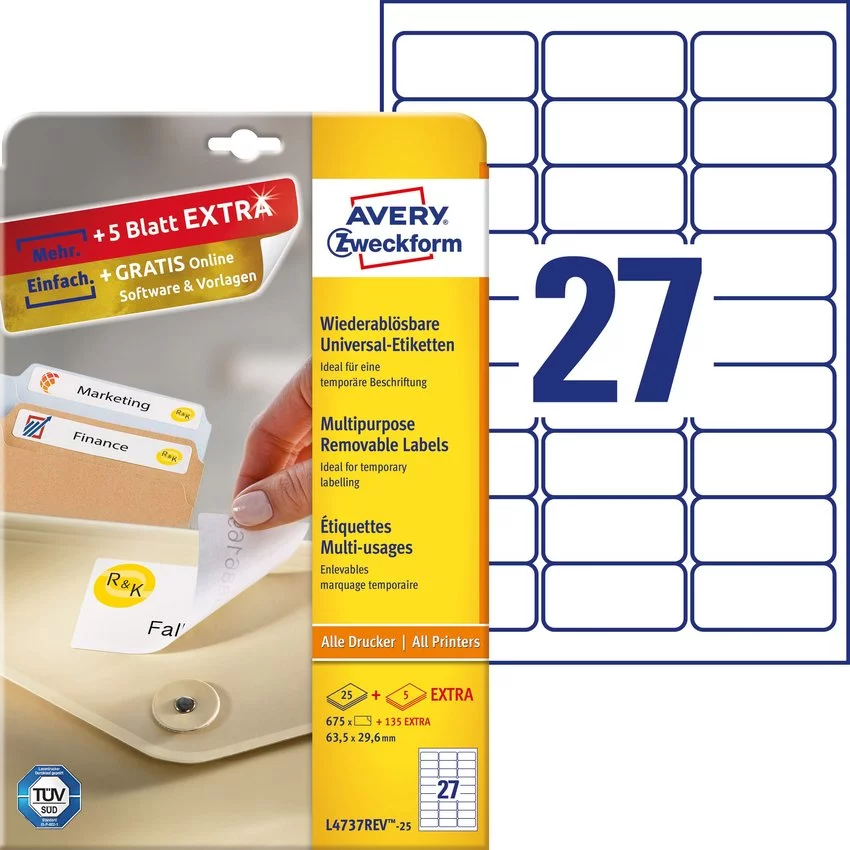 • Etykiety samoprzylepne Avery Zweckform L4737REV-25 w kolorze białym, usuwalne. Łatwe w usunięciu, nie pozostawiają śladów kleju. Do drukarek atramentowych, laserowych oraz kopiarek. Posiadają certyfikat ekologiczny FSC oraz certyfikat jakości TÜV.