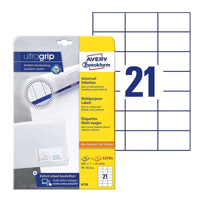 • Etykiety samoprzylepne, uniwersalne Avery Zweckform QuickPeel 6174 w kolorze białym. Łatwe w przyklejaniu i odklejaniu. Gwarancja trwałego, odpornego na ścieranie druku. Do zastosowania w drukarkach laserowych oraz kopiarkach.