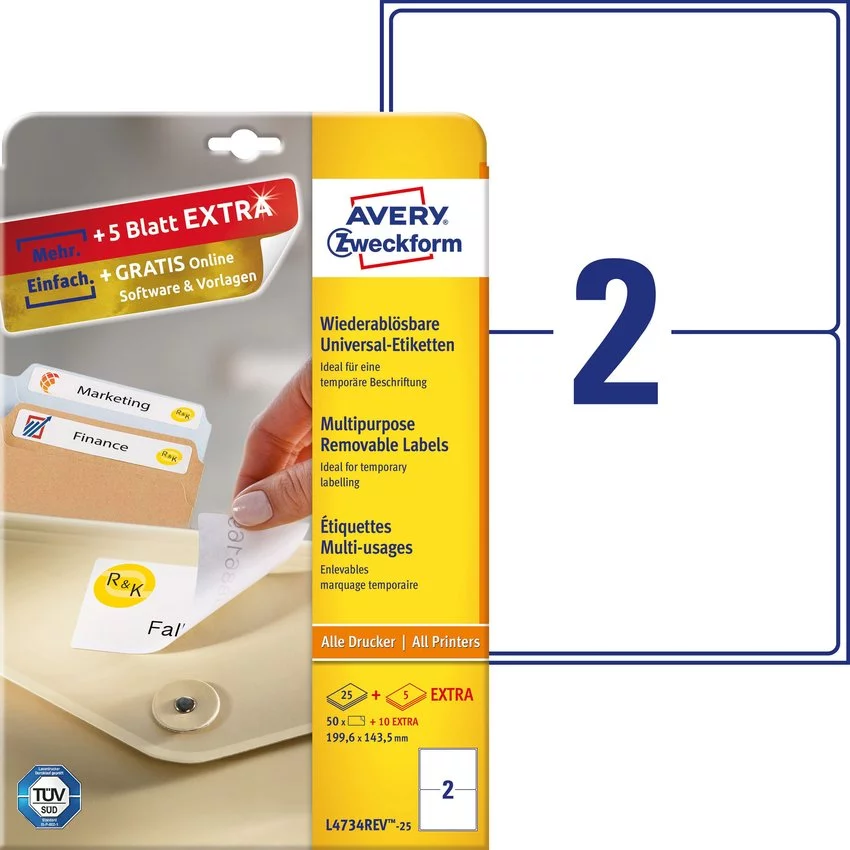 Etykiety Samop. Avery 199.6x143.5 2/A4 A'25 Usuwalne Białe No.L4734REV-25