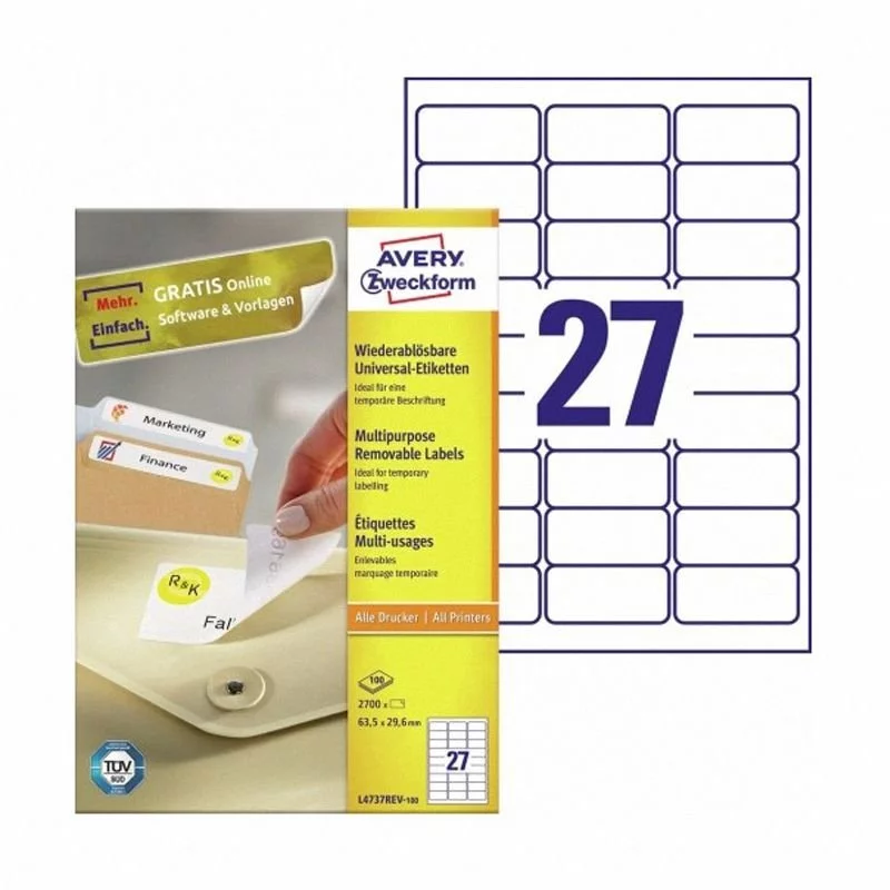 Etykiety Samop. Avery 63,5x29,6 27/A4 A'100 Usuwalne Białe No.L4737REV-100