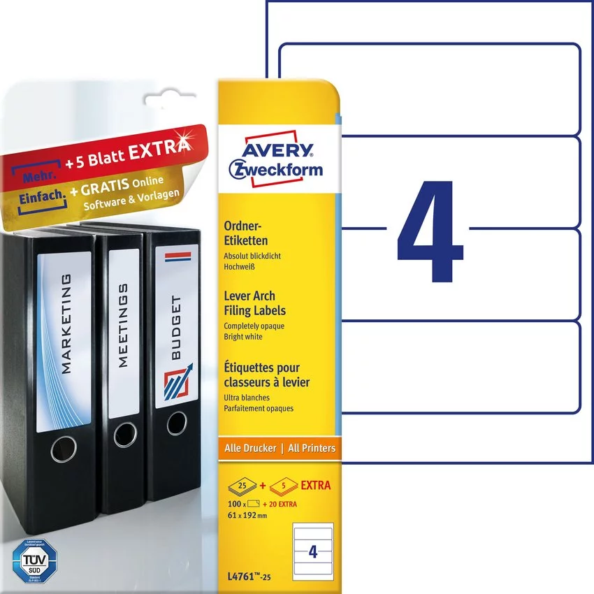 Etykiety do segregatora Avery 192x61 4/A4 A'25 Białe No.L4761-25