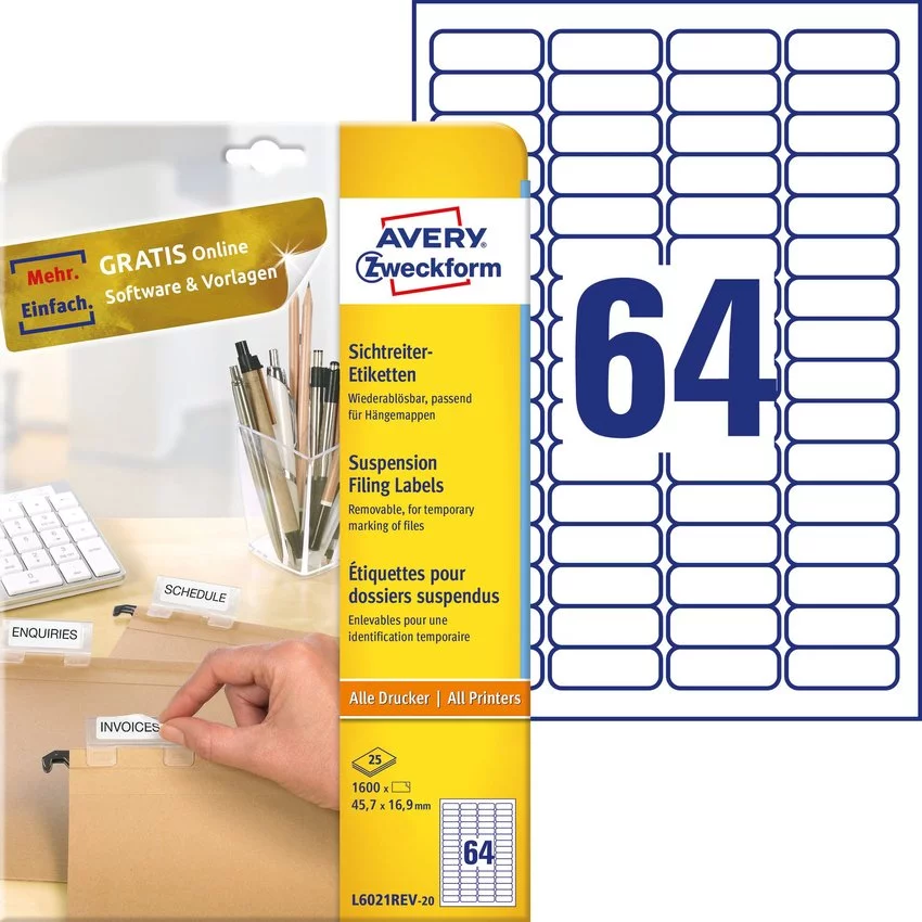 • Etykiety do teczek z zawieszkami Avery Zweckform L6021REV-25, kolor biały. Idealne do oznaczania zawartości teczek. Wykonane z papieru odpornego na brud, wodę, podarcie czy zmiany temperatur.