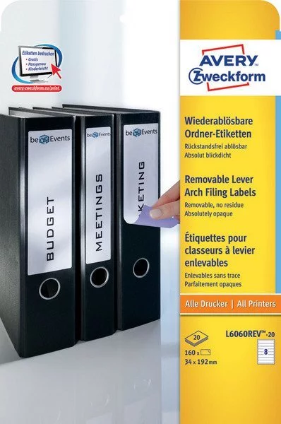 • Etykiety usuwalne do segregatora Avery Zweckform L6060REV-20, kolor biały. Mocno kryjące. Idealne do oznaczania zawartości segregatorów. Do drukarek atramentowych, laserowych oraz kopiarek.