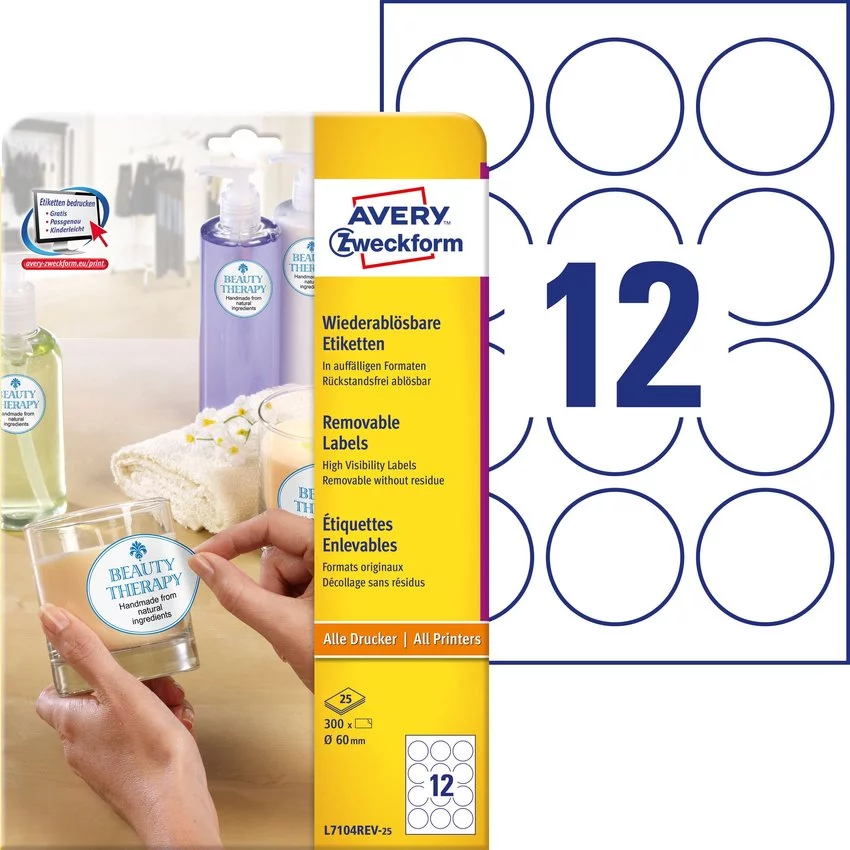 Etykiety Samoprzylepne Avery Okrągłe śr. 60mm 25/A4 A'12 Usuwalne Białe No.L7104REV-25