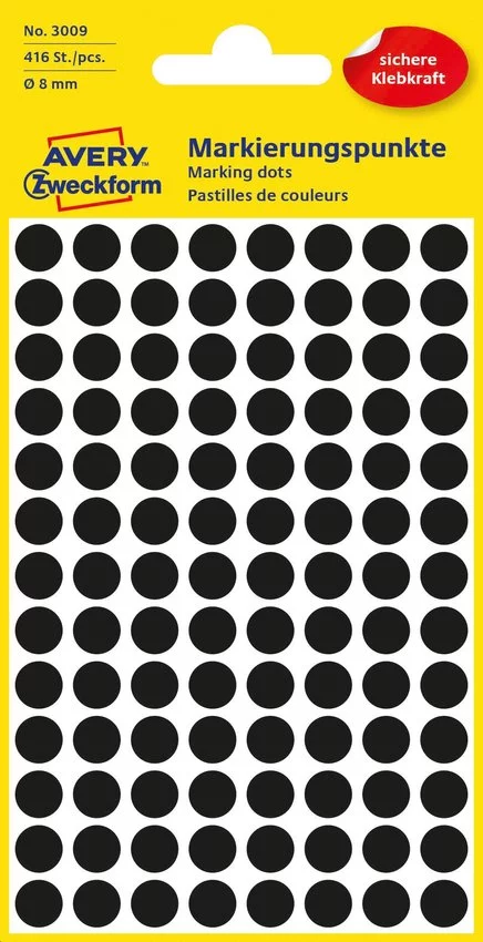 • Kółka Avery Zweckform 3009, kolor czarny. Świetnie sprawdzą się do zaznaczania dat urlopów, spotkań czy miejsc na mapie. Szeroki asortyment rozmiarów i kolorów. Idealne do kolorystycznego oznaczania dokumentów.