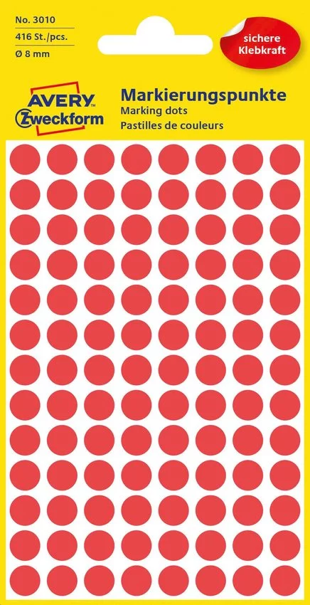 • Kółka Avery Zweckform 3010, kolor czerwony. Świetnie sprawdzą się do zaznaczania dat urlopów, spotkań czy miejsc na mapie. Szeroki asortyment rozmiarów i kolorów. Idealne do kolorystycznego oznaczania dokumentów.