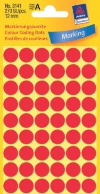 • Kółka do zaznaczania Avery Zweckform 3141, kolor czerwony. Świetnie sprawdzą się do zaznaczania dat urlopów, spotkań czy miejsc na mapie. Szeroki asortyment rozmiarów i kolorów. Idealne do kolorystycznego oznaczania dokumentów.