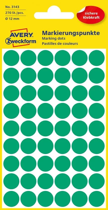 • Kółka do zaznaczania Avery Zweckform 3143, kolor zielony. Świetnie sprawdzą się do zaznaczania dat urlopów, spotkań czy miejsc na mapie. Szeroki asortyment rozmiarów i kolorów. Idealne do kolorystycznego oznaczania dokumentów.