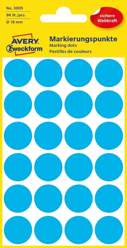 • Kółka Avery Zweckform 3005, kolor niebieski. Świetnie sprawdzą się do zaznaczania dat urlopów, spotkań czy miejsc na mapie. Szeroki asortyment rozmiarów i kolorów. Idealne do kolorystycznego oznaczania dokumentów.