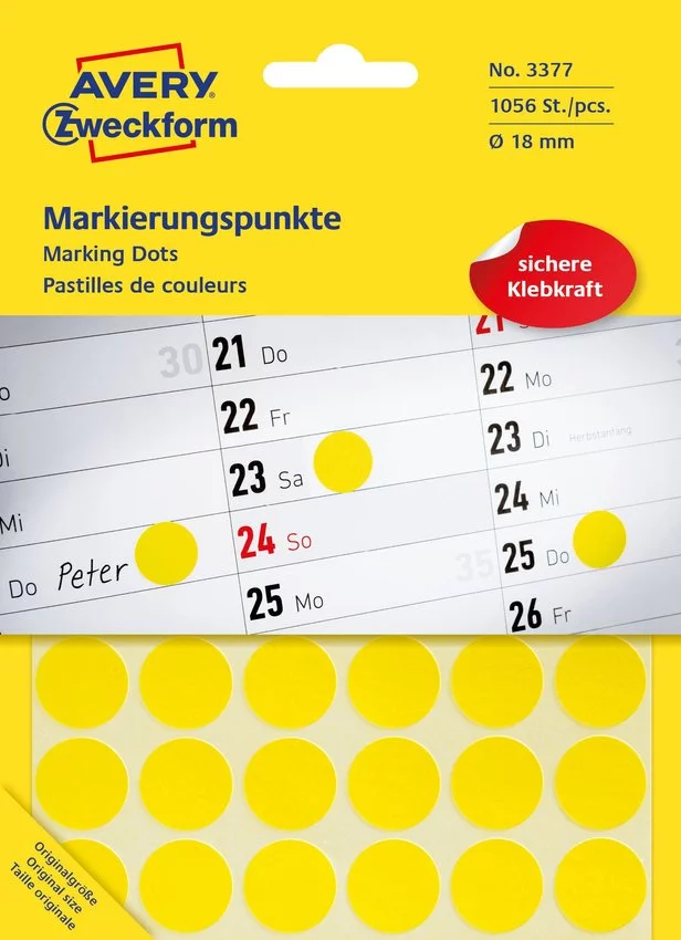• Kółka Avery Zweckform 3377, kolor żółty. Świetnie sprawdzą się do zaznaczania dat urlopów, spotkań czy miejsc na mapie. Szeroki asortyment rozmiarów i kolorów. Idealne do kolorystycznego oznaczania dokumentów.
