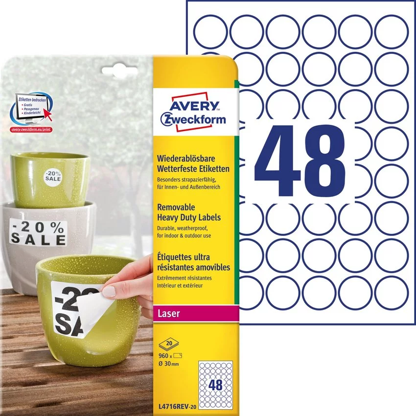Usuwalne Etykiety Samoprzylepne Heavy Duty Okrągłe Avery śr. 30mm 48/A4 A'20 Białe No.L4716REV-20