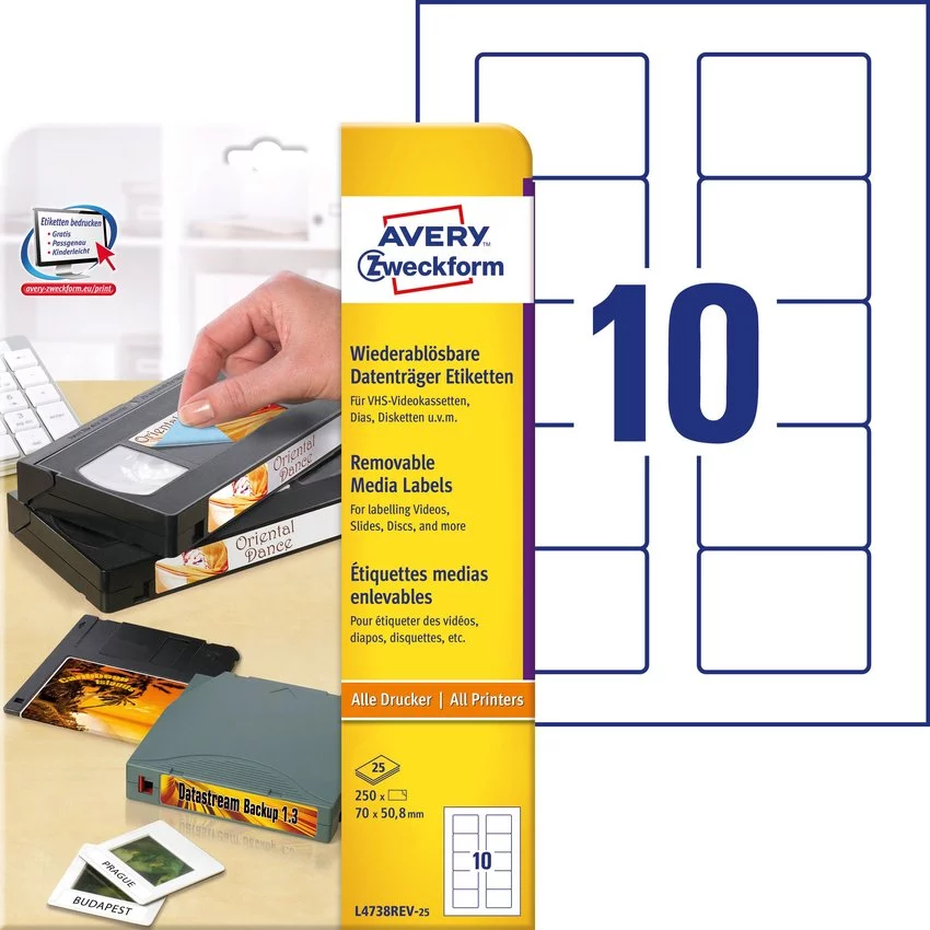 Usuwalne Etykiety na Dyskietki Avery 70x50.8 10/A4 A'25 Białe No.L4738REV-25
