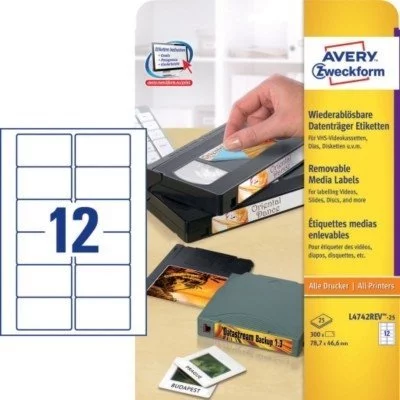Usuwalne Etykiety na Kasety Video Avery 78.7x46.6 12/A4 A'25.8 Białe No.L4742REV-25
