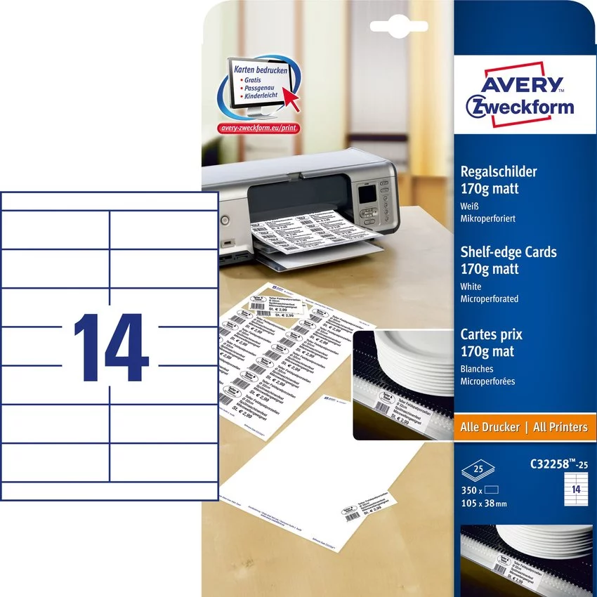 Szyldy na Regały z Mikroperforacją 170g 350szt. Avery 105x38 Białe Matowe No.C32258-25