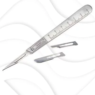 Metalowy skalpel z podziałką mm w uchwycie, z trzema ostrzami wymiennymi, Nr 10, 11 i 15.