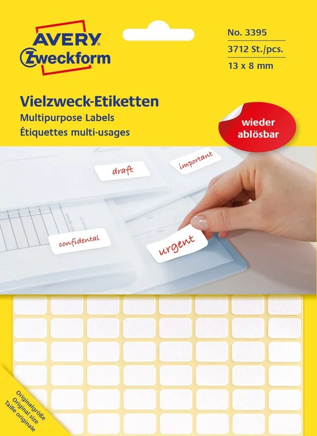 Jak oznaczyć to wszystko tak, aby Twoi współpracownicy wiedzieli, gdzie wszystko się znajduje? Usuwalne etykiety uniwersalne Avery Zweckform w jednej chwili zapewniają porządek i przejrzystość i mogą być opisane odręcznie. Jeżeli ich znaczenie nie jest już aktualne wymień je na nowe. Nasze etykiety usuwalne pewnie przylegają, ale można je łatwo usunąć bez pozostawienia śladu. Skorzystaj z tej prostej i oszczędnej metody aby lepiej zorganizować swoje biuro.