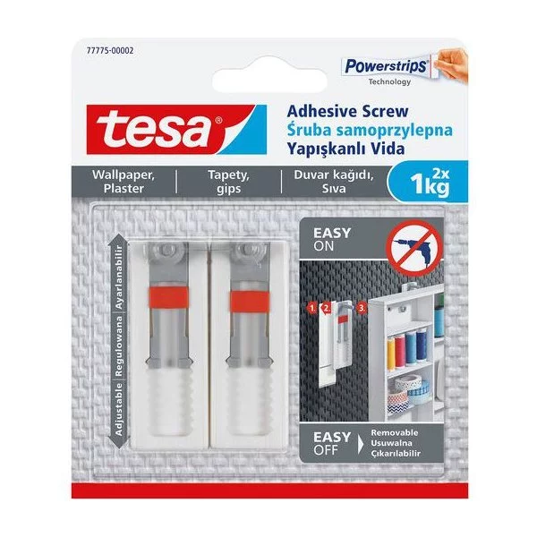 - Regulowana śruba samoprzylepna tesa® do tapet i tynku wraz z plastrami montażowymi zapewnia bezpieczne mocowanie na powierzchniach fakturowanych i delikatnych ciężaru do 1 kg na śrubę.