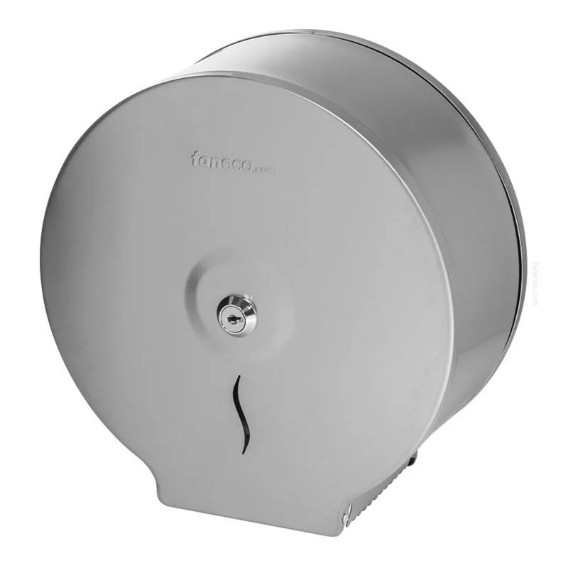 Solidny, duży pojemnik na papier toaletowy, wykonany z dobrej jakości szczotkowanej stali. Matowe wykończenie i gładka powierzchnia ułatwiają utrzymanie pojemnika w czystości. Dozownik jest przeznaczony do użytku w toaletach publicznych. Stal nierdzewna jest trwała i odporna na uszkodzenia. Dozownik mocuje się do ściany na wkręty, co dodatkowo zwiększa jego wytrzymałość. Wizjer pozwala na kontrolę bieżącego zużycia papieru toaletowego, a metalowy zamek i kluczyk zapobiega samoistnemu otwarciu i dostępowi osób trzecich.