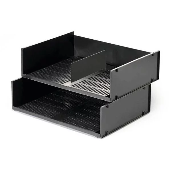 Jej pozioma konstrukcja umożliwia łatwy dostęp do dokumentów, a możliwość ustawienia kilku tacek jedna na drugiej – przy zastosowaniu dodatkowych srebrnych nóżek – pozwala efektywnie zarządzać przestrzenią roboczą. Antracytowy kolor podkreśla nowoczesny i profesjonalny charakter produktu.