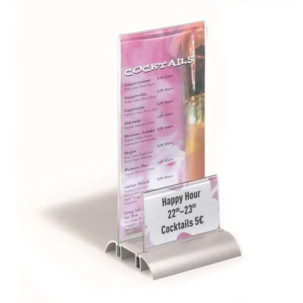 Stojak zawiera solidną, aluminiową podstawę i przejrzyste okno z akrylu, które gwarantuje doskonałą czytelność prezentowanego materiału - z obu stron. Dodatkowo, umożliwia łatwą wymianę zawartości. Ponadto, specjalny system zaciskowy stabilnie utrzymuje akrylową tabliczkę w podstawie. Z kolei, mniejsza płytka akrylowa, może być wykorzystywana do przechowywania wizytówki, bądź prezentacji mniejszych materiałów reklamowych.