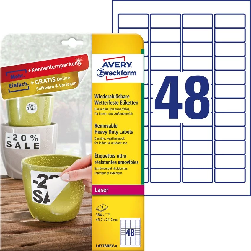 Usuwalne etykiety marki Avery Zweckform, cechuje je: przejrzystość, wysoka jakość, większa wytrzymałość niż etykiety papierowe oraz wielofunkcyjność.