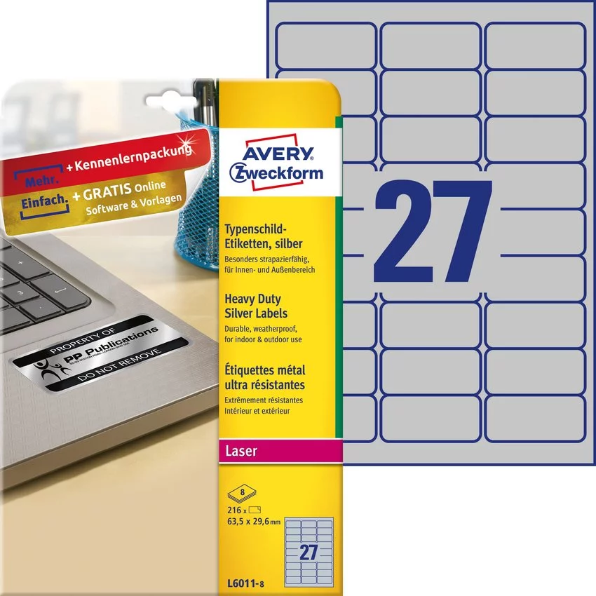 Etykiety Znamionowe Avery 63.5x29.6mm 27/A4 A'8 Srebrne No.L6011-8