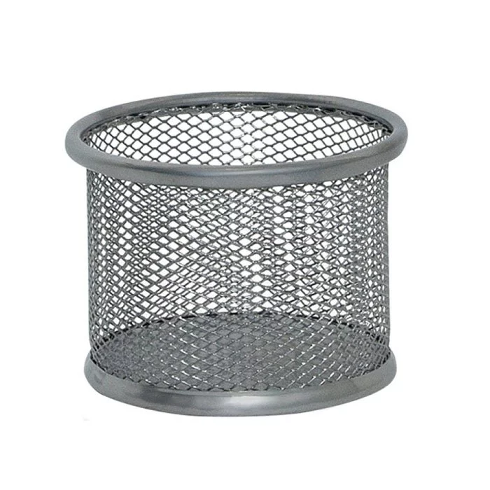 Pojemnik na przybory z metalowej siateczki powlekanej lakierem. Kształt okrągły. Kolor srebrny. Świetnie nadaję się na biurko,szafkę,stolik.Dzięki niemu możemy mieć w jednym miejscu wszystkie potrzebne nam przyrządy kreślarskie na wyciągnięcie ręki.