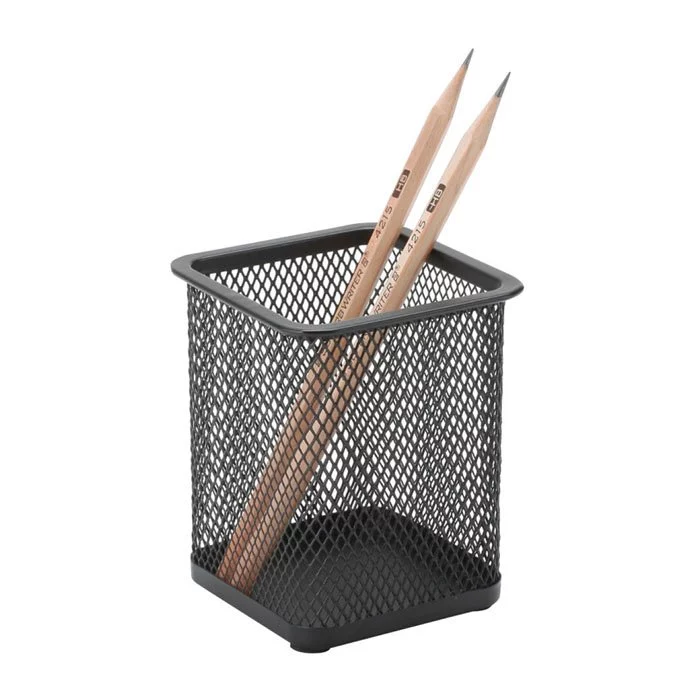 Kwadratowy pojemnik z metalowej siateczki powlekanej lakierem. Kolor czarny. Świetnie nadaję się na biurko,szafkę,stolik.Dzięki niemu możemy mieć w jednym miejscu wszystkie potrzebne nam przyrządy kreślarskie na wyciągnięcie ręki.