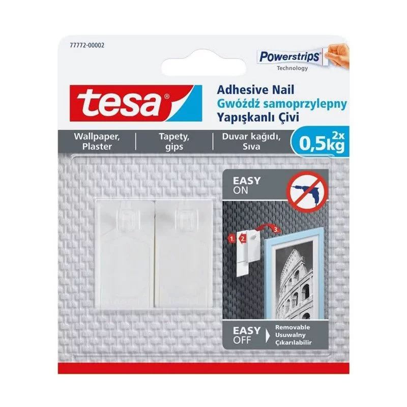 Samoprzylepne gwoździe montażowe, mocowane na plastry samoprzylepny. Zestaw 2szt. Doskonała alternatywa dla zwykłych gwoździ. Aplikacja i demontaż jest bardzo łatwy i nie wymaga wiercenia otworów. Każdy z gwoździ jest wstanie udźwignąć ciężar do 0,5 kg, nie pozostawia żadnych zabrudzeń i można go wykorzystać ponownie dzięki plastrom z serii Powerstrips®. Idealnie nadaje się do wieszania lekkich obrazków, antyram oraz dekoracji na gładkich i fakturowych powierzchniach takich jak tapeta i tynk.