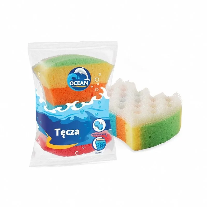 Tęczowa gąbka kąpielowa ze specjalną warstwą do masażu. Posiada specjalne wcięcie ułatwiające trzymanie. Szorstka warstwa delikatnie masuje ciało. Dostępna jest w wielu atrakcyjnych kolorach. Produkt wykonany z pianki poliuretanowej.