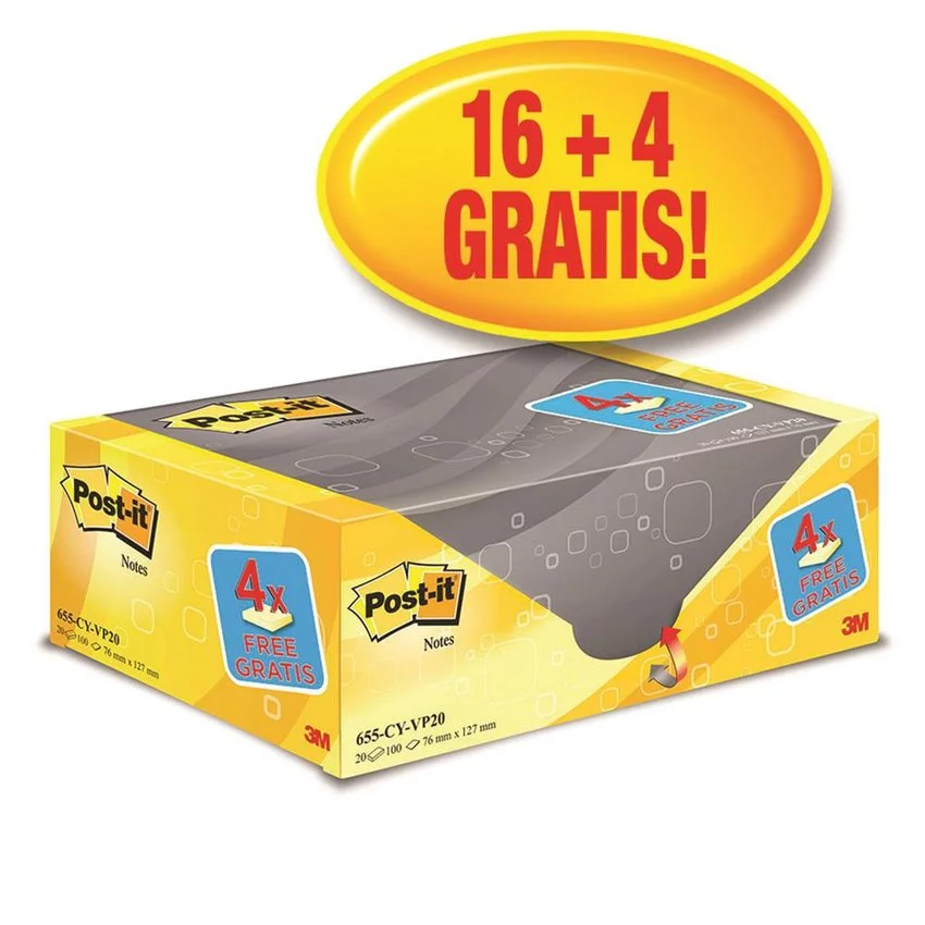 Bloczek Samoprzylepny Post-It (655Cy-Vp20) 127X76Mm 20X100 Kart. Żółte 4 Bloczki Gratis