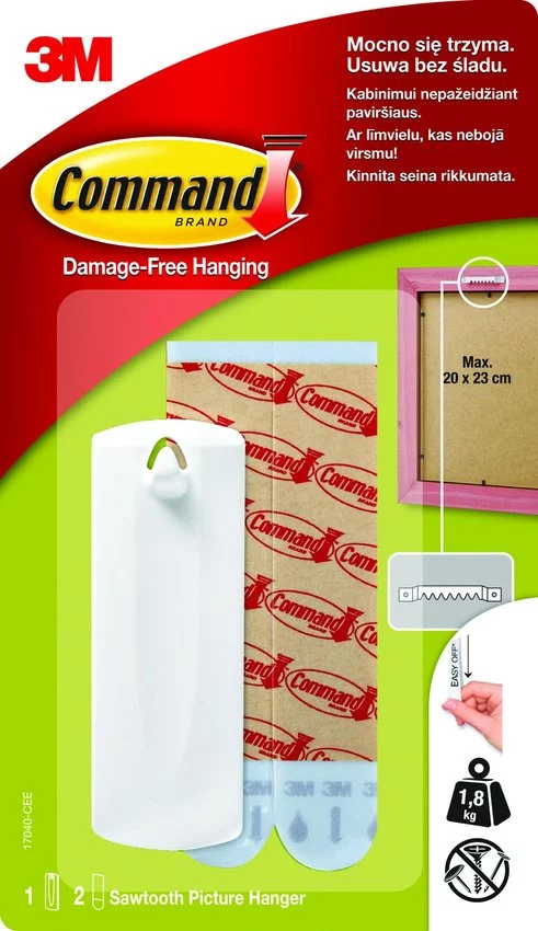 zapomnij o dziurach w ścianach, pęknięciach w gipsie lub resztkach kleju na ścianie, zastąp gwoździe i śrubokręty Commandem™haki i rzepy Command™ nie niszczą powierzchni oraz samych obrazów i ramek haczyk przeznaczony do ramek z uchwytem usunięcie rzepów i haków Command™ jest równie proste jak ich aplikacja, szczególnie kiedy chcesz dowolnie zmienić położenie obrazu lub go zdjąć dzięki paskom uzupełniającym można ich wielokrotnie używać opakowanie zawiera: 1 haczyk i 2 duże paski utrzymuje ramki do: 2,2kg kolor biały