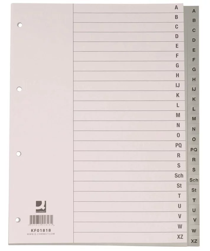 wykonane z ekologicznego polipropylenu o grubości 120µmilość przekładek: 20+1 pierwsza karta opisowa z alfabetem w kolorze szarym indeks: A-Z dziurkowanie: 4 format: A4 rozmiar przekładki: 230x297mm każdy komplet osobno pakowany w folię kolor szary