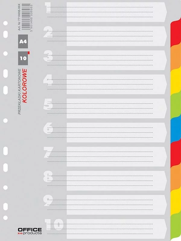 wykonane z kartonu o gramaturze 170gsm, uzyskanego na drodze recyklinguilość kolorowych przekładek: 10+1 pierwsza karta opisowa z numerami w kolorze szarym dziurkowanie: 11 format: A4 rozmiar przekładki: 227x297mm każdy komplet osobno pakowany w folię mix kolorów