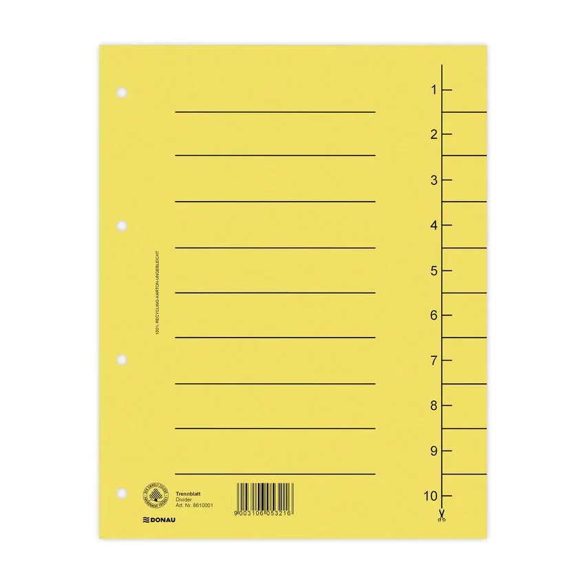 wykonane z grubego kartonu o gramaturze 250gsm uzyskanego na drodze recyklinguindeksy z nadrukowaną linią cięcia umożliwiającą łatwe i szybkie dostosowanie przekładki do indywidualnych potrzeb pierwsza karta opisowa z numerami indeks: 1-10 dziurkowanie: 4 format: A4 rozmiar przekładki: 235x300mm kolor żółty