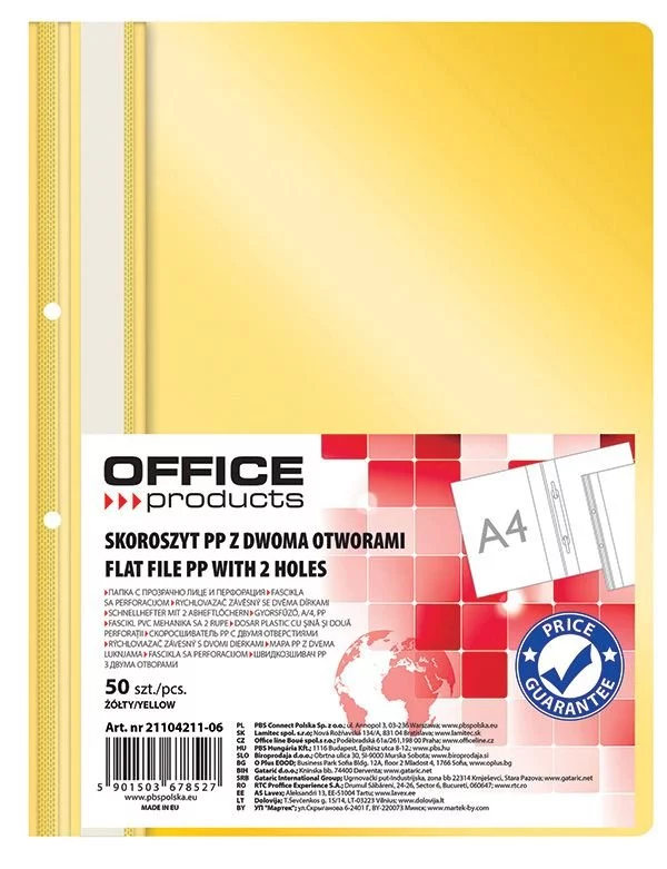 Skoroszyt Office Products PP A4 2 Otwory 100/170 mikr. Wpinany Żółty