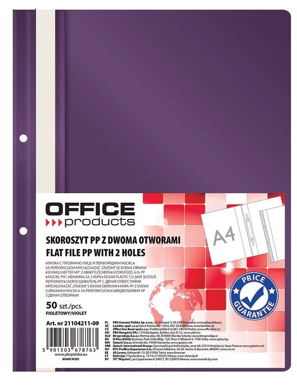 Skoroszyt Office Products PP A4 2 Otwory 100/170 mikr. Wpinany Fioletowy