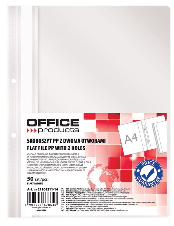 Skoroszyt Office Products PP A4 2 Otwory 100/170 mikr. Wpinany Biały
