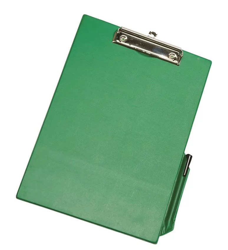 podkładka do pisania bez okładki, wykonana z tektury o grubości ok. 2mmpokryta wysokiej jakości PVC zacisk sprężynowy posiada metalowy zacisk spinający do 50 kartek o gramaturze 70gsm na dłuższym boku znajduje się kieszonka na długopis lub ołówek możliwość zawieszenia podkładki za pomocą specjalnego oczka umieszczonego w zacisku format: A4 rozmiar: 230x350mm kolor zielony