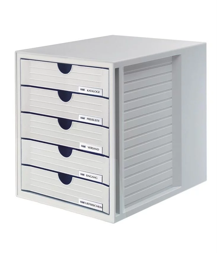 wykonany z trwałego polistyrenuposiada 5 wysuwanych, zamkniętych szuflad przeznaczony na dokumenty o wymiarach 238x305mm wysokość zestawu dopasowana do wysokości segregatorów A4 - idealnie pasuje do regałów i szaf dedykowanych na segregatory w komplecie 5 klipsów opisowych z etykietami wymiary: 275x330x320mm kolor szary