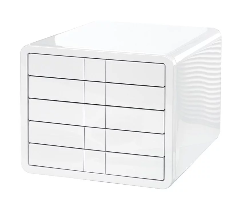 wykonany z niezwykle mocnego, antystatycznego tworzywa ABSpowierzchnia o wysokim połysku zapewnia ekskluzywny wygląd posiada 5 płynnie wysuwanych szuflad każda szufladka z dyskretnym uchwytem, pod którym umieszczone jest miejsce na etykietę opisującą zawartość transparentna nakładka chroni etykietkę przed pobrudzeniem przeznaczony na dokumenty o wymiarach 229x324mm antypoślizgowe podkładki zapobiegają przemieszczaniu się zestawu i ochronią blat w komplecie specjalna ściereczka do czyszczenia oraz 32 etykiety opisowe nowoczesny design - zdobywca wielu nagród, m.in. nagrody reddot design award 2010, nagrody Interior innovation award 2011 wymiary: 247x295x355mm kolor biały