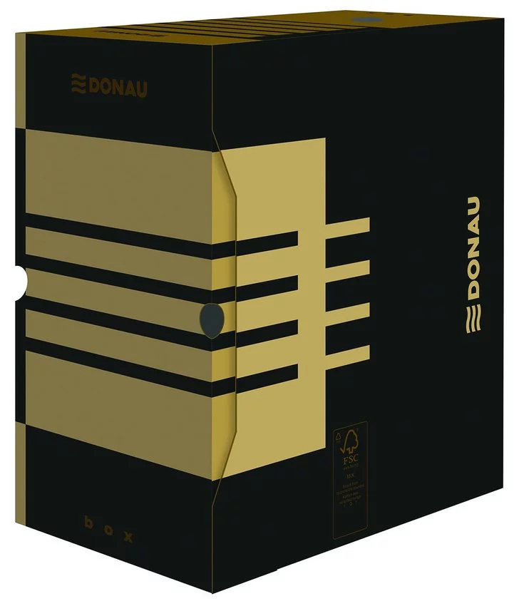wykonane z trójwarstwowej tektury falistej o gramaturze 390gsmprodukt bezkwasowy (pH ok. 7,5) typ fali: B szerokość grzbietu: 155mm pojemność: do 1550 kartek o gramaturze 80gsm mieści 2 segregatory A4/75mm, wysokość pudła dopasowana do wysokości segregatora posiada 5 otworów ułatwiających wkładanie/wyjmowanie oraz 5 ścian opisowych pasuje do wszystkich pudeł zbiorczych Donau możliwość stawiania na krótszym lub dłuższym boku posiada certyfikat FSC format: A4 wymiary: 155x340x297mm kolor brązowy